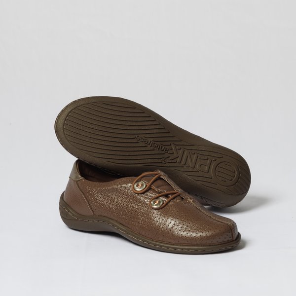 A sola flexível e antiderrapante garante estabilidade em diferentes superfícies, proporcionando uma experiência de caminhada confortável e segura. A paleta de cores em marrom, com acabamento sofisticado, complementa a elegância do modelo, tornando-o fácil de combinar com diversas roupas.